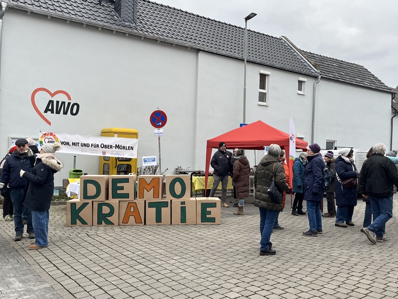 Am 15. Februar 2025 traf sich die AWO Ober-Mörlen mit Freunden der Demokratie am AWO-Häuschen in der Mitte Ober-Mörlens. Die Veranstaltung zielte darauf ab, die Ober-Mörler zu motivieren, am 23. Februar zur Wahl zu gehen. Um die Aufmerksamkeit der Bürger zu gewinnen und das Bewusstsein für die Bedeutung der Wahlen zu schärfen, wurde eine große Wand aus Pappkartons mit Denkanstößen zum Thema aufgestellt. Wie ein Puzzle konnten die Kartons umgesetzt werden und zeigten immer wieder ein neues Bild.