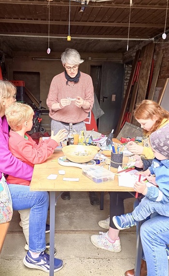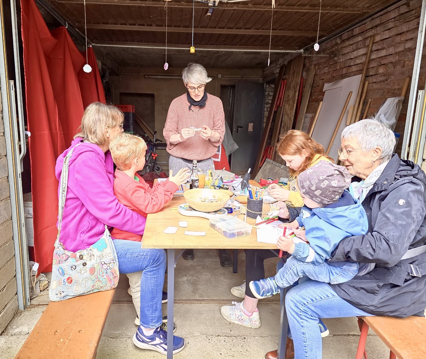 Die Kaffeetafel war liebevoll gedeckt, drinnen wie draußen wurden immer wieder Stühle und Gedecke ergänzt, um allen Gästen Platz zu bieten. Währenddessen bastelten die mitgebrachten Kinder entspannt an ihrem eigenen Tisch. Auch der gelegentliche Nieselregen konnte die Gespräche nicht verstummen lassen.