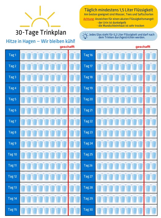 Schon früh in diesem Jahr haben wir mit Hitzewellen zu tun. Hier gehören Senioren zu den am meisten gefährdeten Gruppen. Oft wird das Trinken vergessen, das bei diesen Temperaturen so wichtig ist. Deshalb gibt es jetzt für die Besucher unseres Seniorentreffs am Montag einen Plan, mit dessen Hilfe man die benötigte Trinkmenge gut im Griff haben kann.