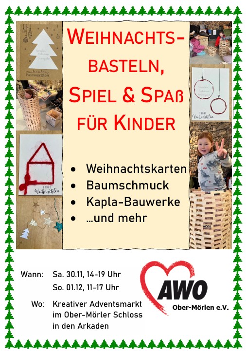 Am kommenden Wochenende sind wir bei dem Adventsmarkt im Schloss vertreten. Wir bieten in den Arkaden ein Bastelangebot für Kinder und stehen natürlich auch für Fragen zu unseren anderen Angeboten zur Verfügung. Das Bastelteam hat sich viele schöne Überraschungen ausgedacht. Kommen Sie vorbei, vertrauen Sie uns Ihre Kinder an und genießen Sie in Ruhe die anderen Stände im Schloss.