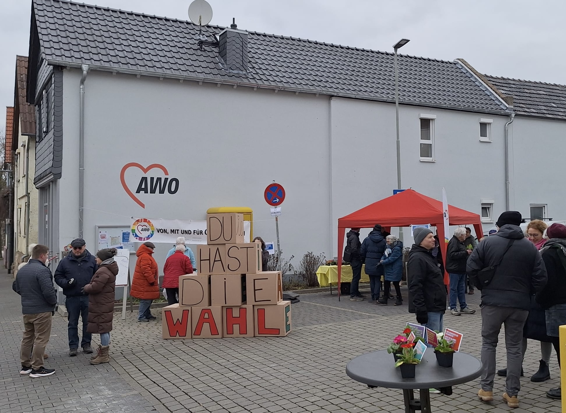 Am 15. Februar 2025 traf sich die AWO Ober-Mörlen mit Freunden der Demokratie am AWO-Häuschen in der Mitte Ober-Mörlens. Die Veranstaltung zielte darauf ab, die Ober-Mörler zu motivieren, am 23. Februar zur Wahl zu gehen. Um die Aufmerksamkeit der Bürger zu gewinnen und das Bewusstsein für die Bedeutung der Wahlen zu schärfen, wurde eine große Wand aus Pappkartons mit Denkanstößen zum Thema aufgestellt. Wie ein Puzzle konnten die Kartons umgesetzt werden und zeigten immer wieder ein neues Bild.