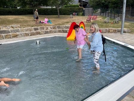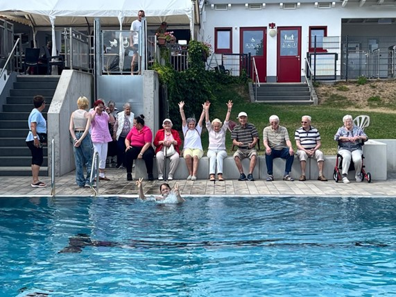 Am letzten Donnerstag war es soweit. Zwei Busse und Privatautos standen bereit, es ging nach Maibach ins Schwimmbad. Dort wurde die Gruppe bereits von Jasmin erwartet, die alle kennen, weil sie auch ehrenamtlich im Plaudercafé aktiv ist. Dort wurde viel ausprobiert, es wurde gelacht und das kulinarische Angebot des Schwimmbades getestet. Allen machte es sichtlich Spaß, deshalb soll dieses Angebot demnächst mit einem neuen Ziel wiederholt werden.